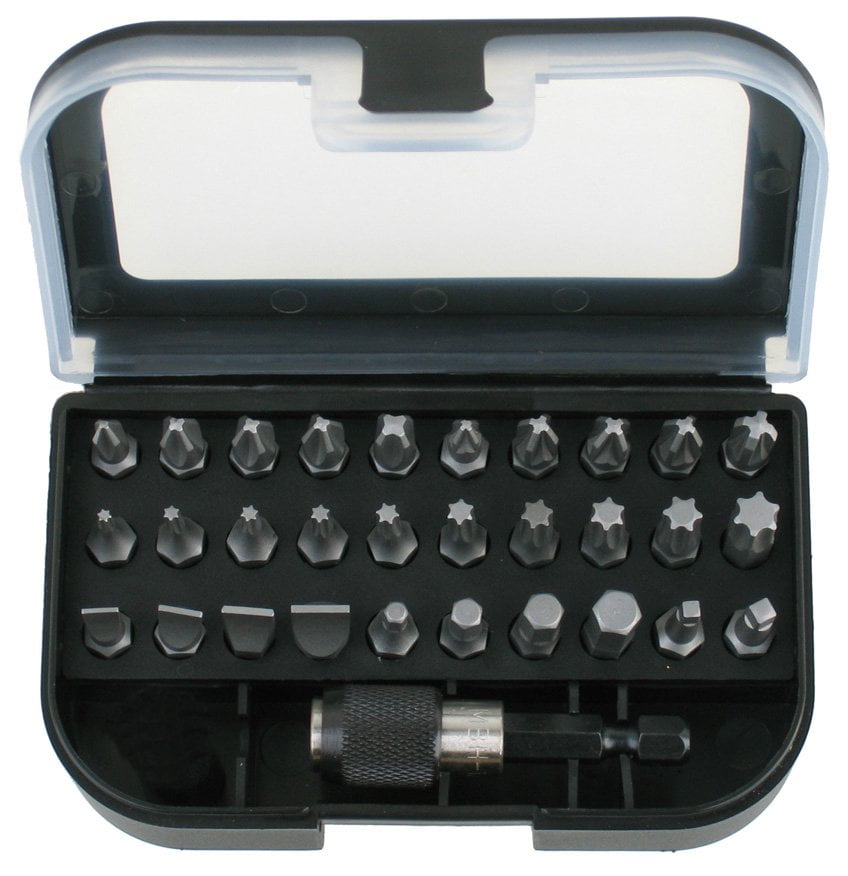 Wemax bitsbox i plast med genomskinligt lock och bältesclip i 31 delar där bitsen sitter fast med ”clickfunktion”. Spår 5,0 / 6,0 / 7,0 / 8,0 mm, Phillips PH1 / 3 st PH2 / PH3, Pozidriv PZ1 / 3 st PZ2 / PZ3, Torx TTX7 / TTX8 / TTX9 /TTX10 / TTX15 / TTX20 / TTX25 / TTX27 / TTX30 / TTX40, Sexkant 3,0 / 4,0 / 5,0 / 6,0 mm, 4-kantbits R1 / R2, Bitshållare med quick-release funktion för snabba byten och säkert fäste. Levereras i displaykartong med 15 st satser.