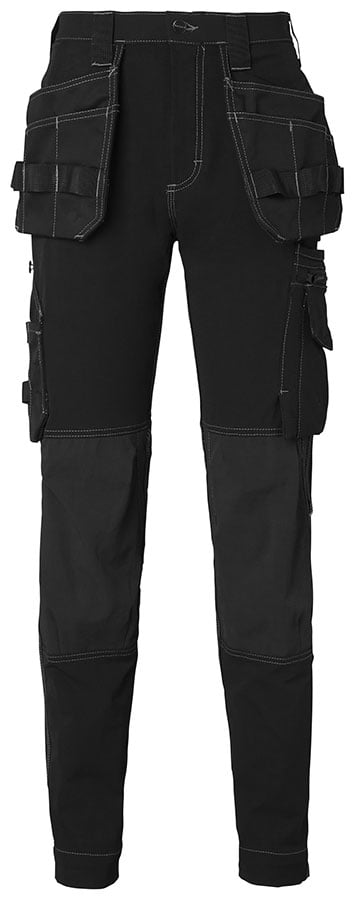 Hantverksbyxa i modern dam passform i 4-vägs stretch. Byxan har förböjda ben och knäfickor av Cordura®. Knäskydden kan placeras i två nivåer. Två framfickor. Två förstärkta bakfickor med bälg. Löst hängande spikfickor förstärkta med Cordura®. Hängfickorna är utrustade med tre extra fack och verktygshällor. Id-kortsficka. Reglerbar hammarhank. Framflyttad tumstocksficka som är släppt nertill för bättre komfort. Tumstocksfickan är utrustad med två knivhållare, knivhälla och pennficka. Benficka med dragkedja, stor extraficka samt telefonficka. Reflexdetalj bak för ökad synbarhet.
